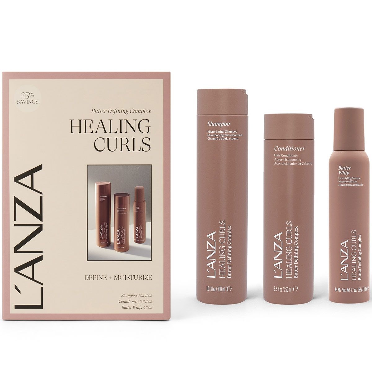 De L'ANZA Healing Curls Holiday Set bestaat uit: Healing Curls Shampoo 300ml, conditioner 250ml, en de Butter Whip 168ml.