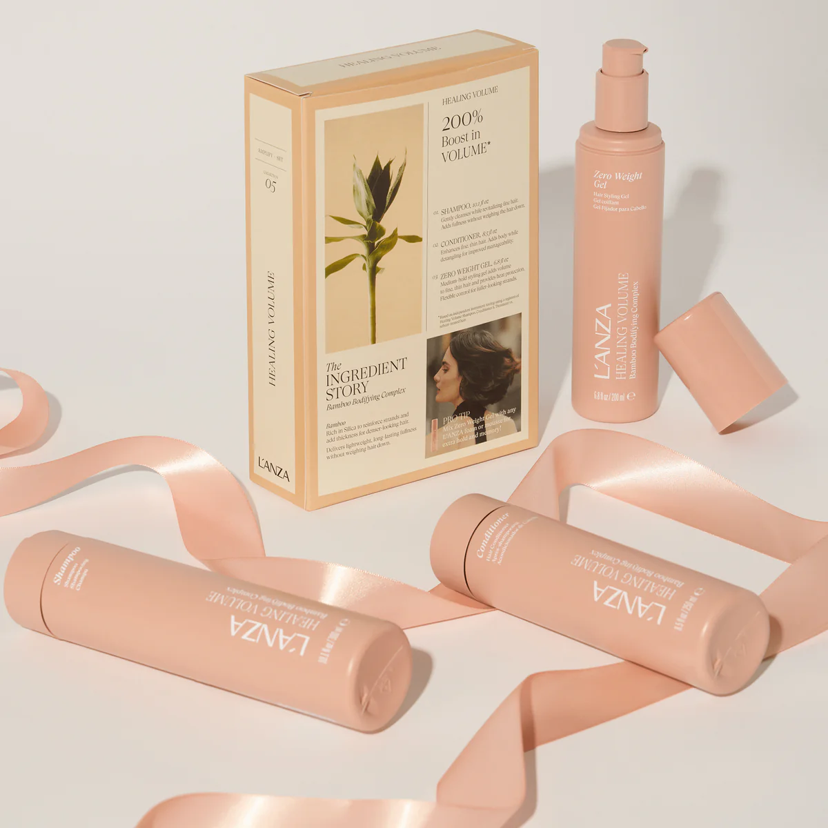 De L'ANZA Healing Volume Holiday Set bestaat uit: Healing Volume Shampoo 300ml, conditioner 250ml en de Zero Weight Gel 200ml.