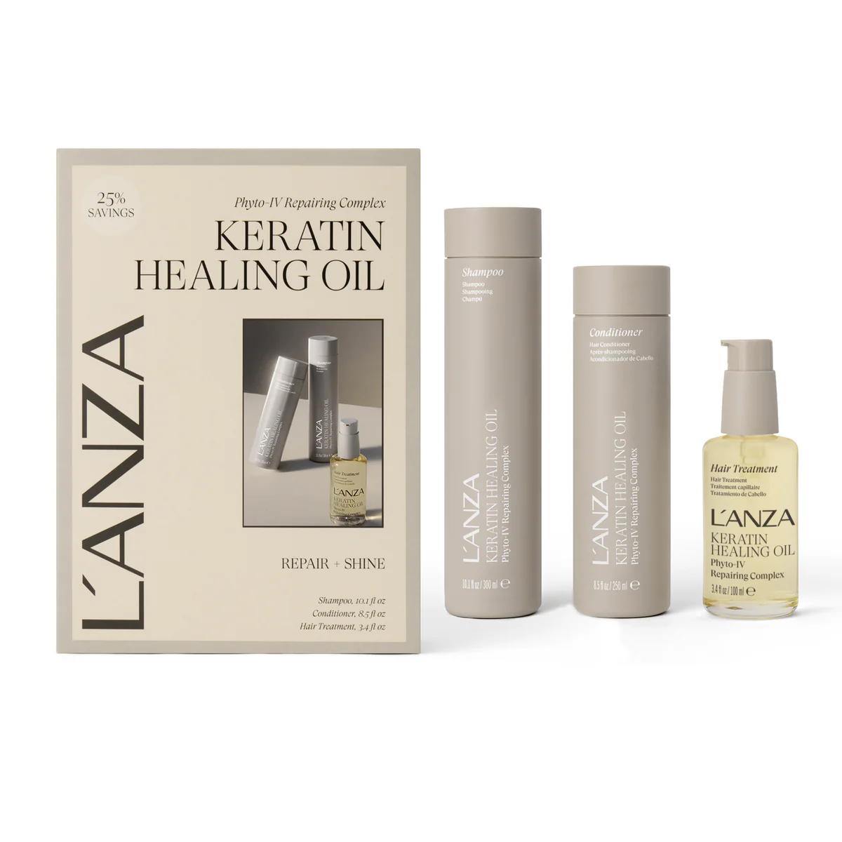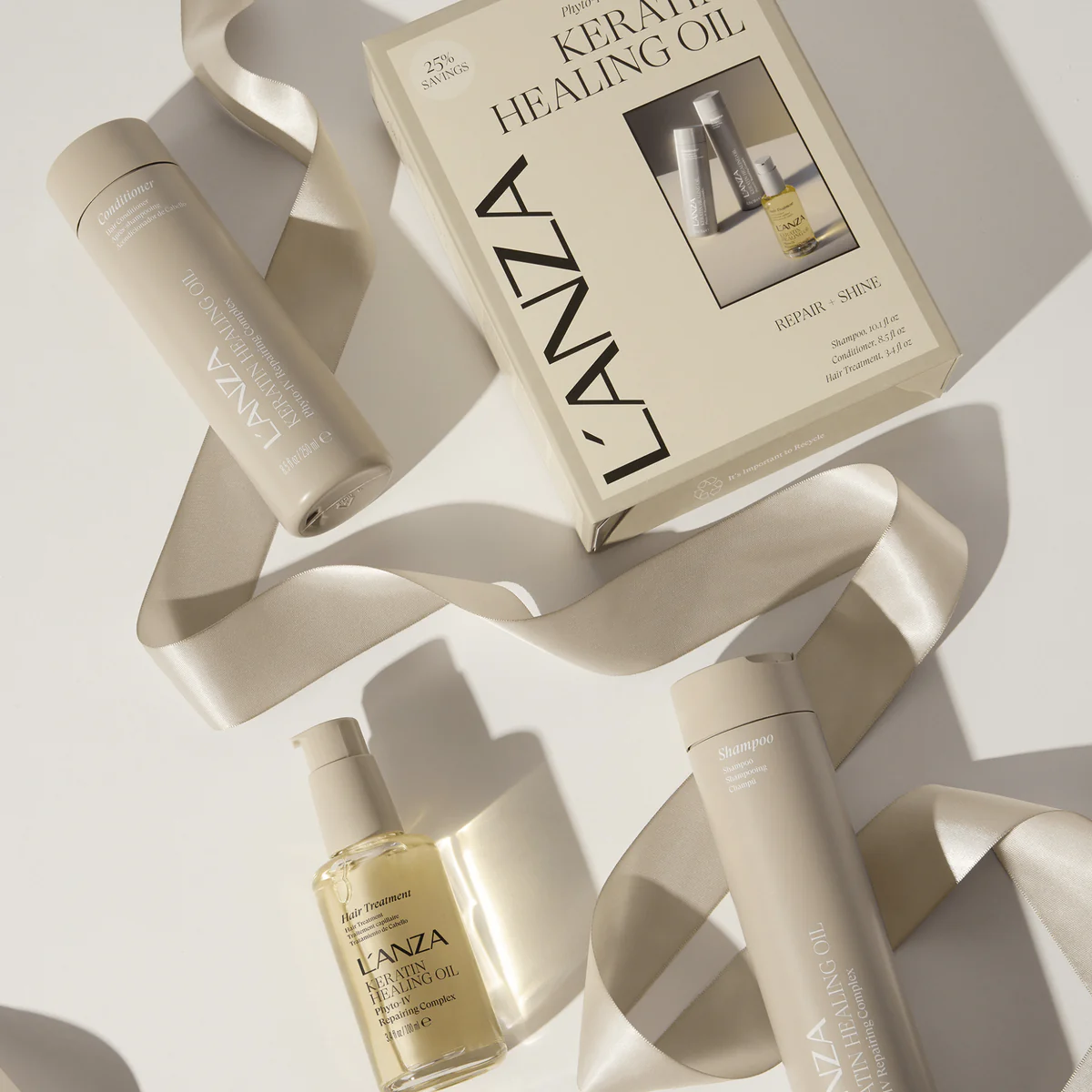 De L'ANZA Keratin Healing Oil Holiday Set bestaat uit: Keratin Healing Oil Shampoo 300ml, Conditioner 250ml, en de Hair Treatment 100ml.