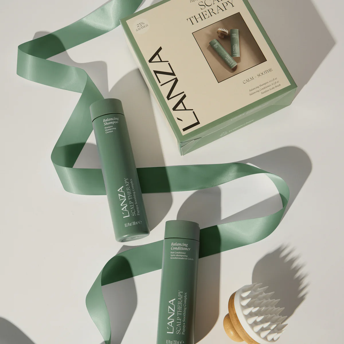 De LANZA Scalp Therapy Holiday Set bestaat uit: Scalp Therapy Balancing Shampoo 300ml, Conditioner 250ml en een prachtige Bamboo Scalp Brush.
